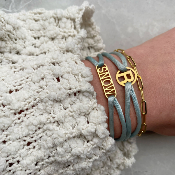 Onze River Name Bracelet kan samengesteld worden met naam , initialen , cijfers en satijnen koord naar wens.